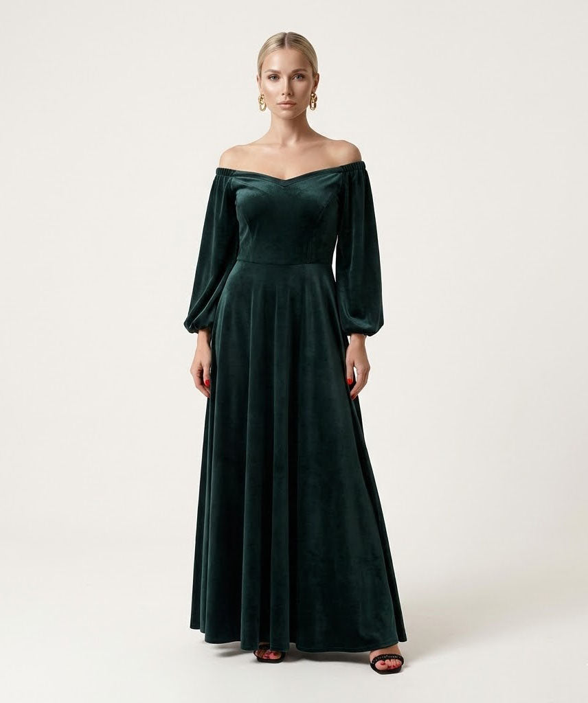Zaļa samta midi kleita ar pieguļošu topu un pussaules svārku daļu